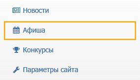 Для добавления афиши на сайт перейти в Личный кабинет, под заголовком «Управление сайтом» выбрать ваше учреждение. В панели управления сайтом перейти в раздел «Афиша», кликнув по нему левой кнопкой мыши.