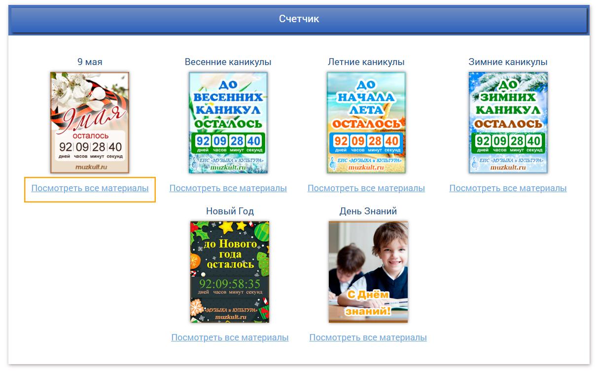Перейти в раздел «Графические материалы» по ссылке в соответствии с наименованием вашего портала. В открывшемся окне выбрать подраздел «Счетчик», выбрать тематику счетчика. Нажать на ссылку «Посмотреть все материалы».