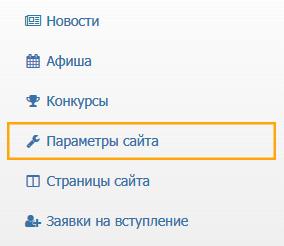 Перейти в Личный кабинет, под заголовком «Управление сайтом» выбрать ваше учреждение. В панели управления сайтом перейти в раздел «Параметры сайта», кликнув по нему левой кнопкой мыши.