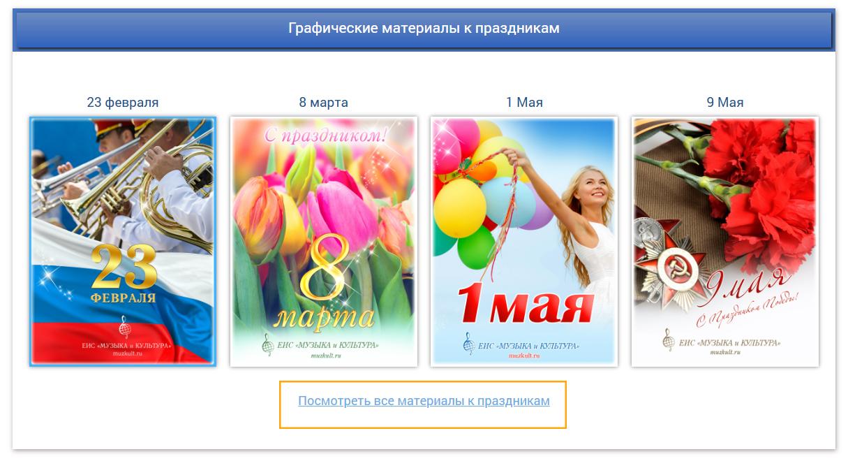 Перейти в раздел «Графические материалы» по ссылке в соответствии с наименованием вашего портала. В открывшемся окне выбрать подраздел «Графические материалы к праздникам». Нажать на ссылку «Посмотреть все материалы к праздникам».