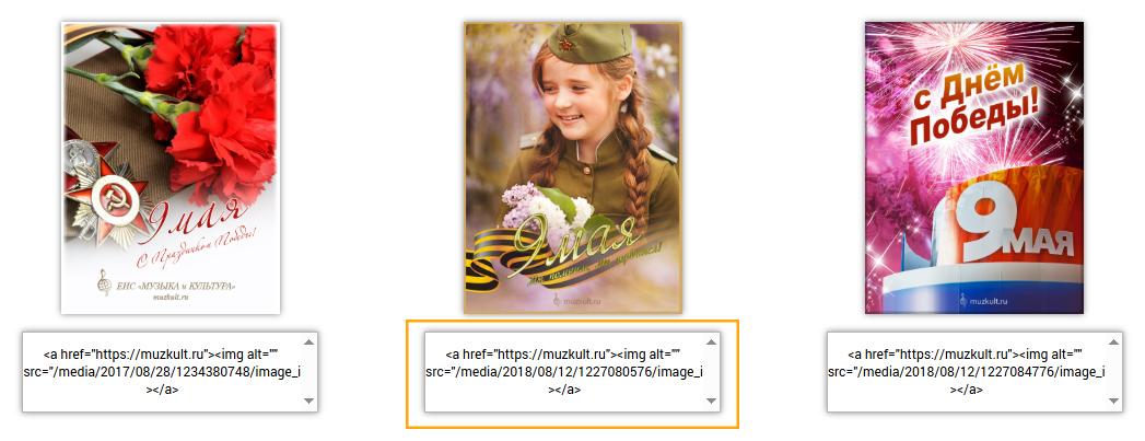 Выбрать тематику праздника, нажать на ссылку «Посмотреть все материалы». Выбрать дизайн открытки, скопировать код для вставки.