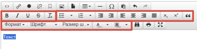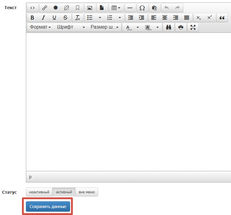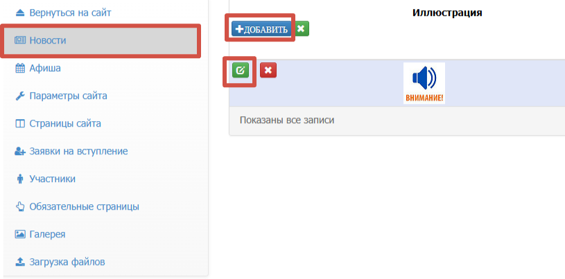 Для редактирования перейти в один из разделов главного меню и открыть страницу для редактирования. Во всех разделах редактор выглядит и работает одинаково.