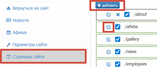 «Страницы сайта» → «Добавить» или значок «редактировать»