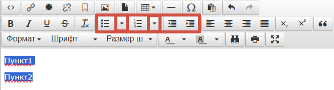 Выделить пункты списка → нажать «Маркированный список» или «Нумерованный список». Использовать кнопки «Увеличить отступ» и «Уменьшить отступ» для изменения структуры списка. Вид маркера и нумерации изменить по стрелке рядом с кнопкой соответствующего списка.