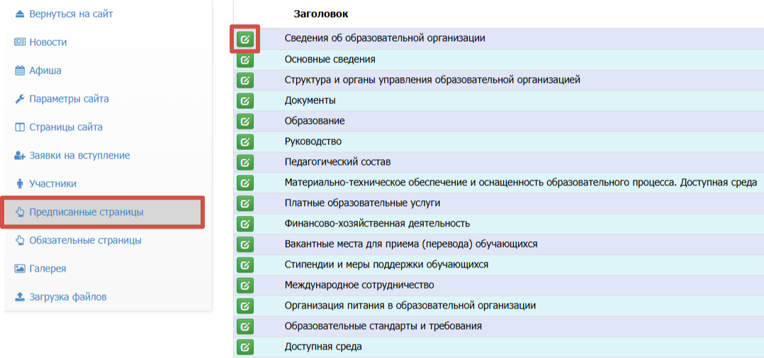 «Предписанные страницы» или «Обязательные страницы» → значок «редактировать»