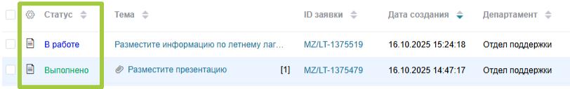 После авторизации в системе на экране отображается список ваших заявок - вы сможете просмотреть историю и отследить статус их выполнения. Когда задача выполнена, статус меняется (Выполнено) и ответ от поддержки отображается в карточке задачи.