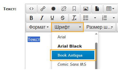 Выделить ранее размещенный на странице текст. Для изменения гарнитуры шрифта в контекстном меню нажать на иконку «Шрифт», в списке всплывающего меню выбрать название гарнитуры, сохранить изменения.