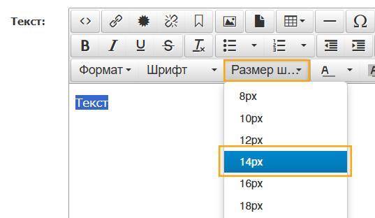 Для изменения размера шрифта в контекстном меню нажать на иконку «Размер шрифта», в списке всплывающего меню указать требуемый размер шрифта в пикселях, сохранить изменения.