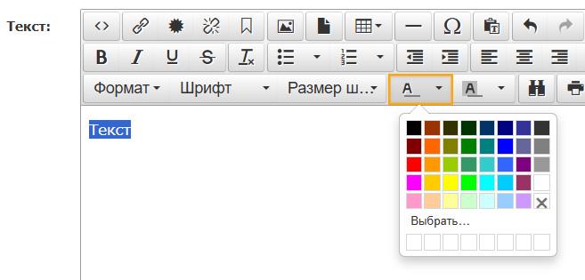 Для изменения цвета шрифта в контекстном меню нажать на иконку «А (цвет текста)», во всплывающей цветовой палитре указать требуемый цвет шрифта из предустановленных образцов либо создать новый образец нажатием на кнопку «Выбрать».
