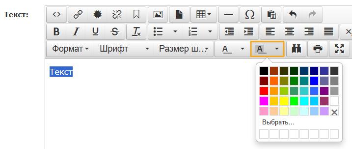 Для изменения фона шрифта в контекстном меню нажать на иконку «А (цвет фона)», во всплывающей цветовой палитре указать требуемый цвет фона шрифта из предустановленных образцов либо создать новый образец нажатием на кнопку «Выбрать». Сохранить изменения.