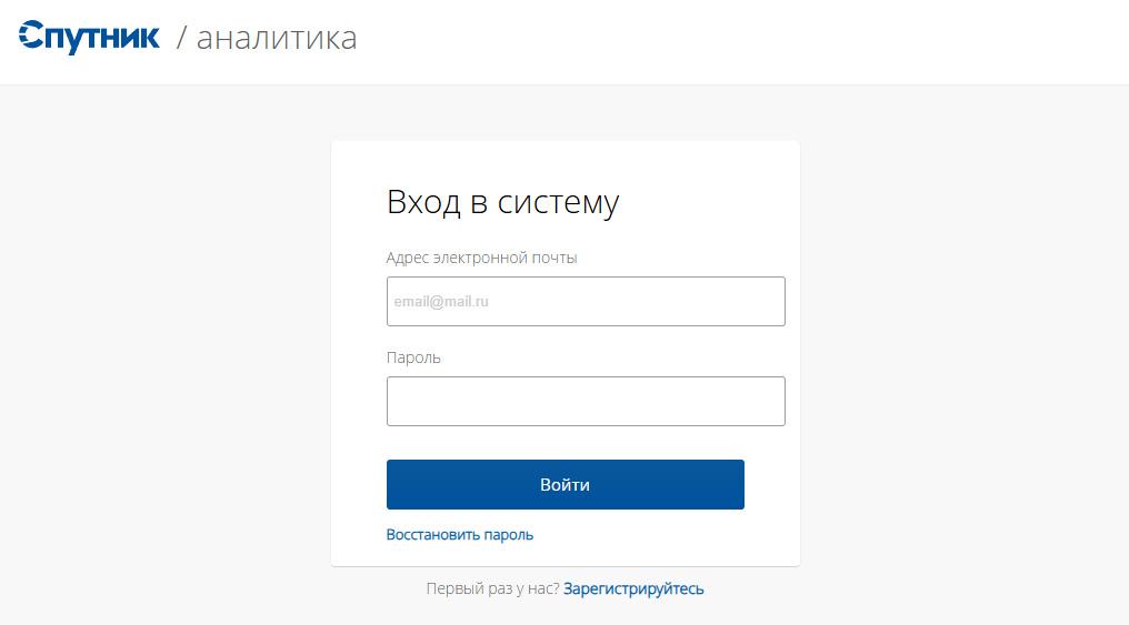 Для просмотр статистики зайти в личный кабинет счетчика «Спутник Аналитика». Пройти авторизацию.