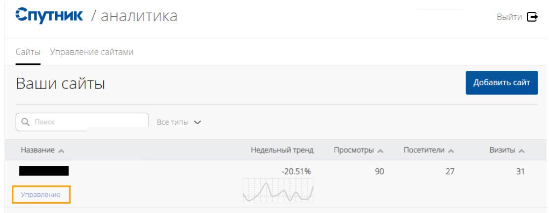 Откроется информационное окно счетчика. Перейти в раздел «Сайты». В колонке «Название» найти адрес вашего сайта. Под адресом сайта нажать на ссылку «Управление».