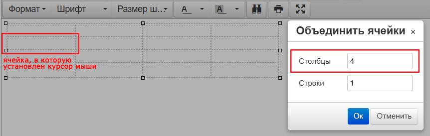 Поместить курсор мыши в ячейку, с которой начнется объединение. Слияние ячеек происходит слева направо. «Таблица»→«Ячейка» - «Объединить ячейки». В открывшемся окне «Объединить ячейки» указать количество строк/столбцов, которые необходимо объединить, начиная от ячейки, где находится курсор мыши. В примере приведена таблица, состоящая из 4 столбцов. В первую ячейку второй строки был установлен курсор мыши и произведено объединение всех столбцов в одну ячейку.