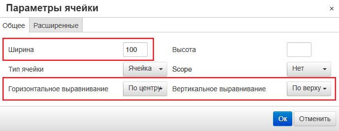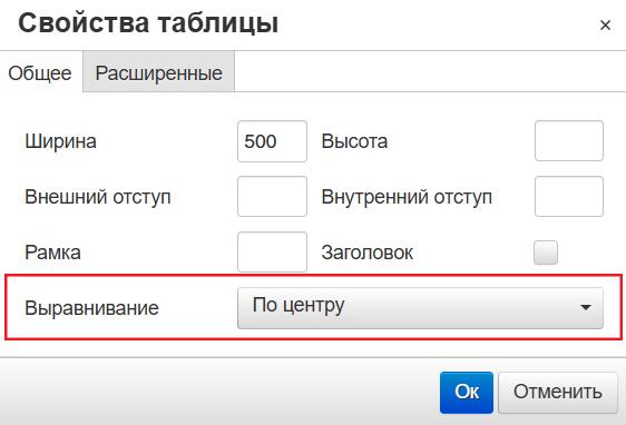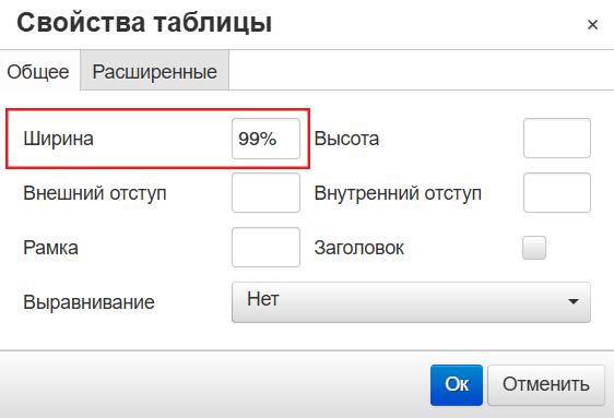 В открывшемся окне в поле «Ширина» задать параметры ширины таблицы. Чтобы таблица всегда автоматически подстраивалась под размер экрана, указать в поле ширина 99%, в поле «Выравнивание» установить опцию «По центру».