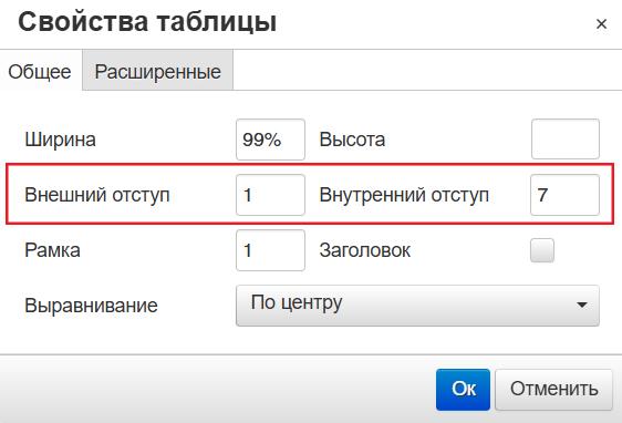 В поле «Рамка» установить нужное значение. Параметр «Внутренний отступ» задает расстояние в пикселях от границ ячеек до текста и изображений внутри ячейки. Параметр «Внешний отступ» задает расстояние между ячейками таблицы, добавляя между их границами пустое поле (если параметр не равен 0, у ячеек появляется двойная внутренняя и внешняя граница).
