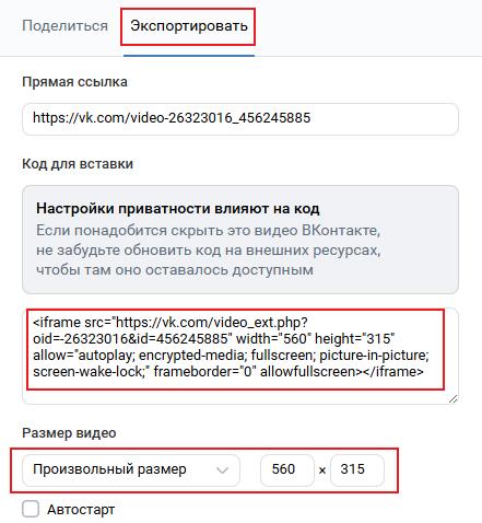 Нажать на кнопку «Поделиться» и в открывшемся окне выбрать пункт «Экспортировать». В выпадающем списке «Размер видео» выбрать пункт «Произвольный размер» и установить требуемые ширину и высоту видео. Рекомендуемые параметры 560x315. Скопировать появившийся код в буфер обмена.